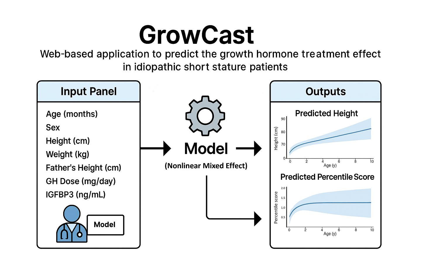 GrowCast is a web-based R-Shiny application that predicts the growth hormone (GH) treatment effect in patients with idiopathic short stature (ISS). By entering patient information and treatment parameters, the app provides visual forecasts of expected height trajectories and percentile changes. The model applies a Nonlinear Mixed Effect model to deliver interpretable and accurate predictions. The output displays predicted height curves (with uncertainty intervals) and percentile scores in interactive graphs. With its intuitive UI and instantly reactive interface, users can easily assess the expected treatment outcomes.