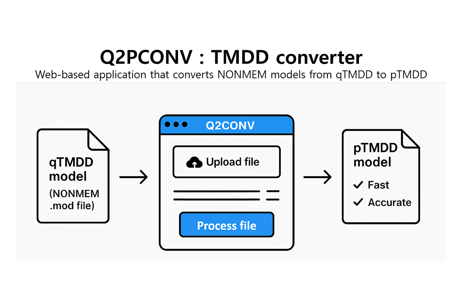 Q2PCONV is a web-based R Shiny tool that converts qTMDD models into the newly developed pTMDD approximation. The pTMDD model, derived from the qTMDD model via first-order Taylor expansion, provides higher accuracy than traditional Michaelis-Menten models while being faster to compute than the Quasi-Steady-State (qTMDD) approach. Users can upload NONMEM .mod files and specify options such as receptor type, observation type, and receptor compartment. With a single click, the tool processes and translates the qTMDD model into pTMDD format. The converted file can then be reviewed and downloaded directly from the application.