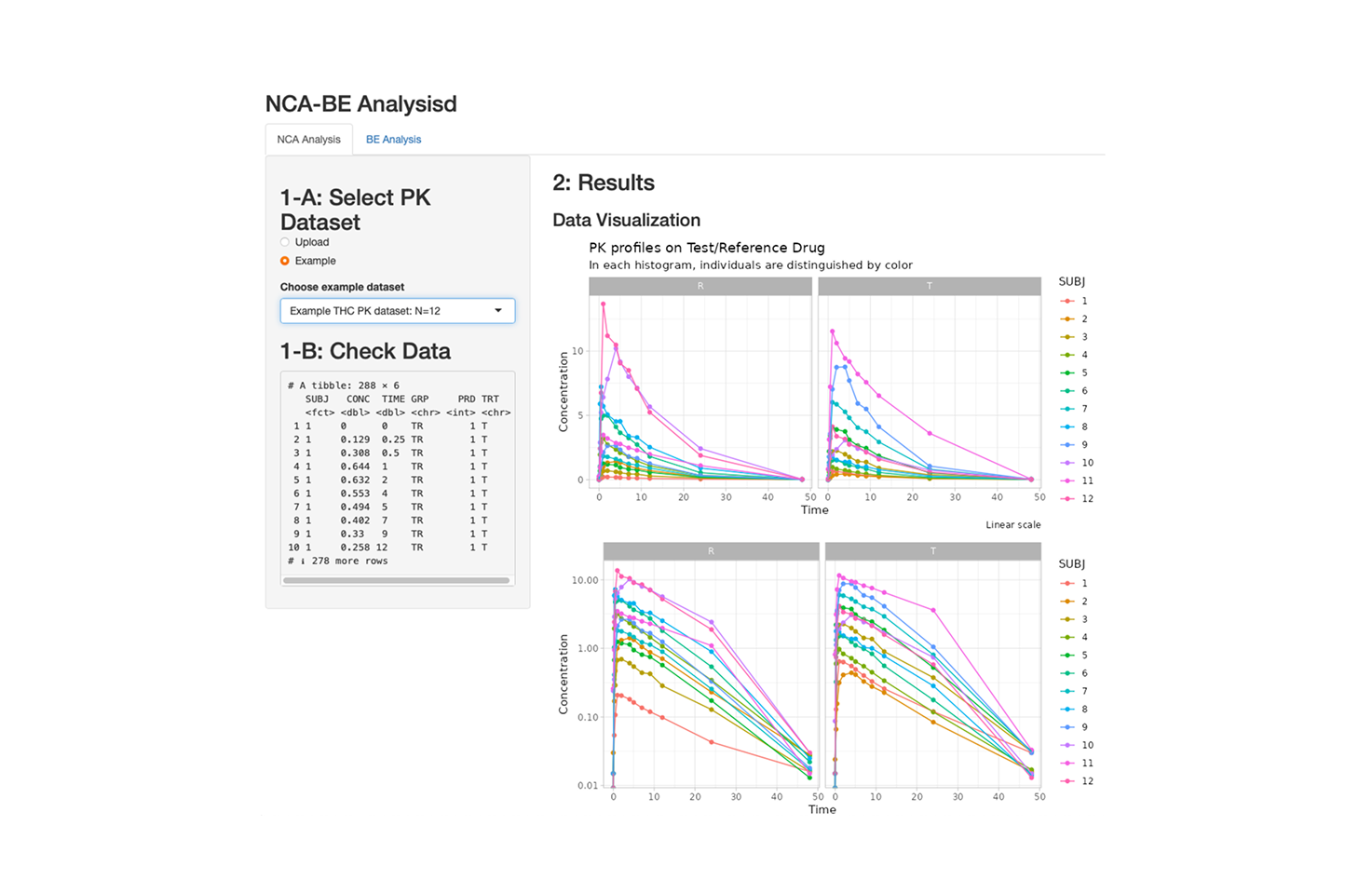 A tool to perform basic non-compartmental pharmacokinetic (NCA) analysis and conduct standard bioequivalence testing between an investigated drug (Test) and its reference formulation (Control). Users can quickly explore exposure parameters and evaluate BE criteria through an intuitive interface.
